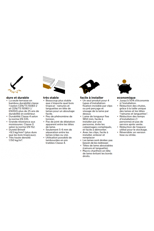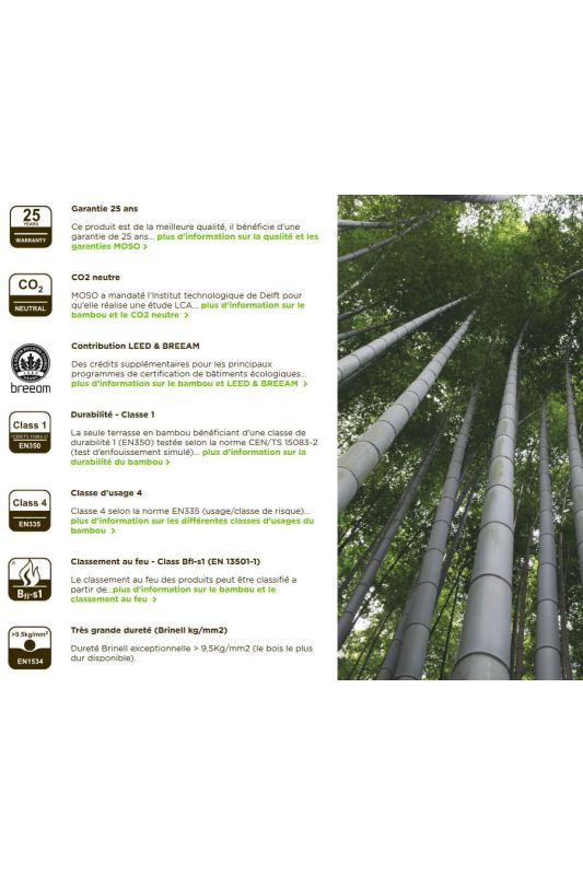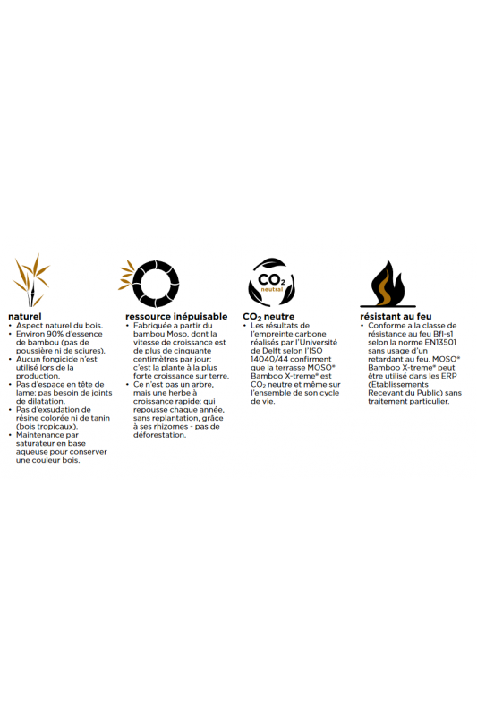 Ces lames de terrasse sont fabriquées à partir de fibre de bambou thermo traitée et compressée à très haute pression. Ce double traitement la rend apte à une installation en extérieur, plus particulièrement comme revêtement de sol. Notre traitement breveté confère à la terrasse une stabilité dimensionnelle, une durabilité et une dureté exceptionnelles, supérieures aux meilleures essences de bois tropicaux.